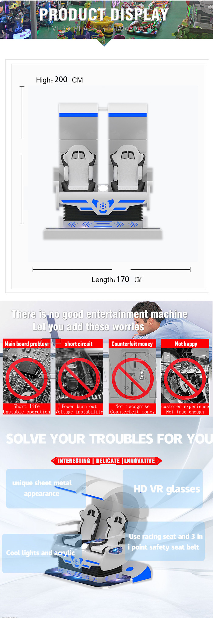 We make a full sense of technology machine,cool LED light line around the pearl white space body,presenting to consumers a sense of Fashion Technology and catch people's eyes in virtual reality.Our touch screen also can support coin operation system for consumer.