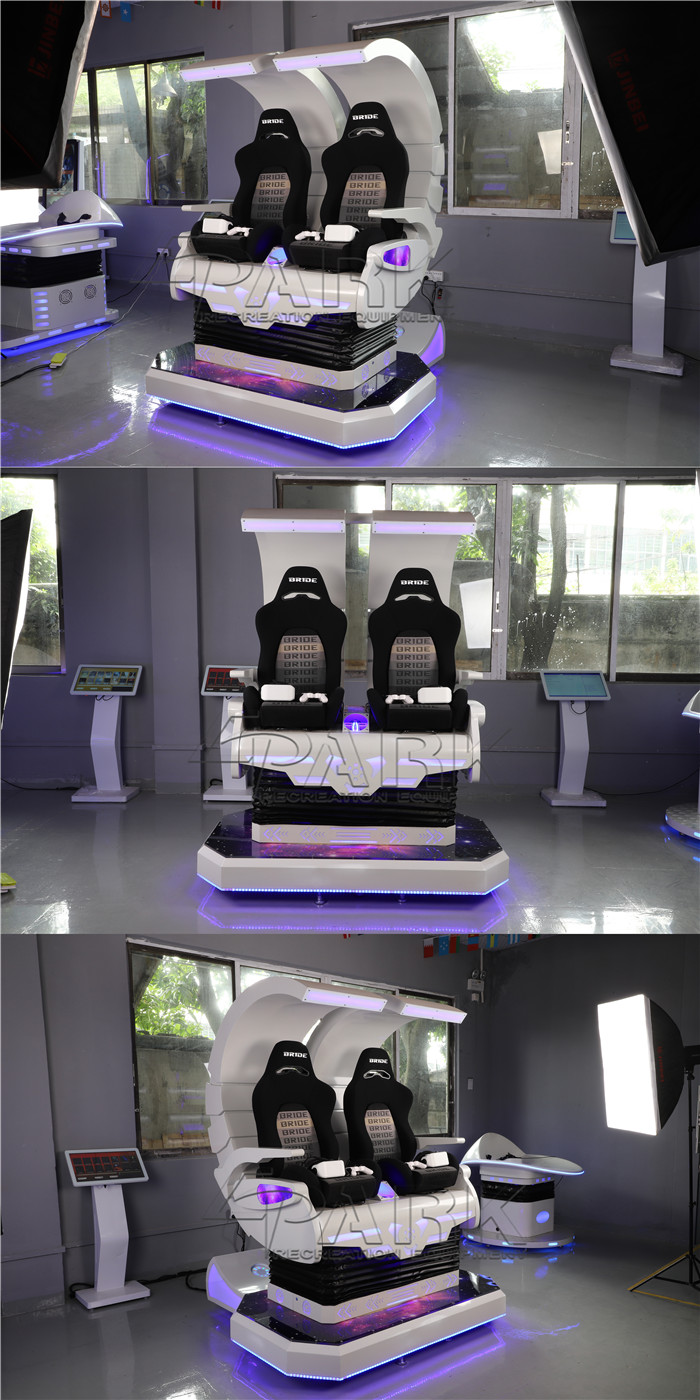 9d 2 Seater Simulator is also called VR Time Machine.We use high quality materials of metal & fiber-reinforced plastics stoving varnish process to build a chassis solid and steady module and cover on the spaceship body design.